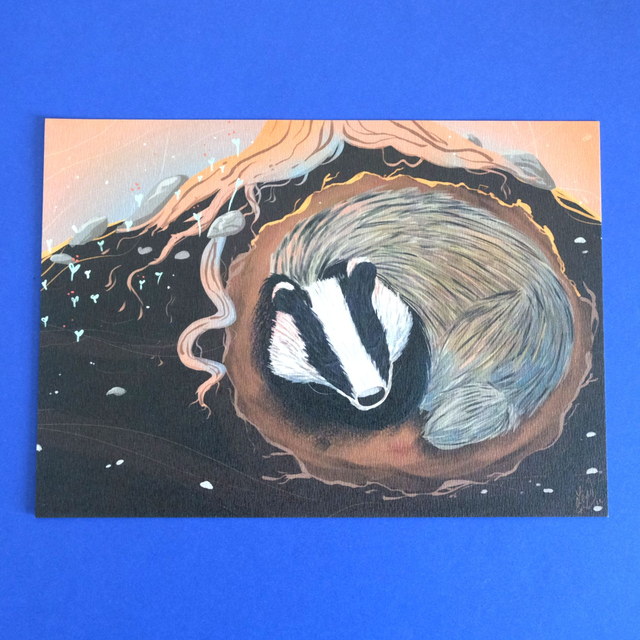 Cette illustration représente un blaireau européen dans son terrier. Elle est extraite de la collection d'illustration du podcast "À travers leurs yeux". Je voulais créer une image réconfortante, qui rappelle la douce chaleur d'un foyer.