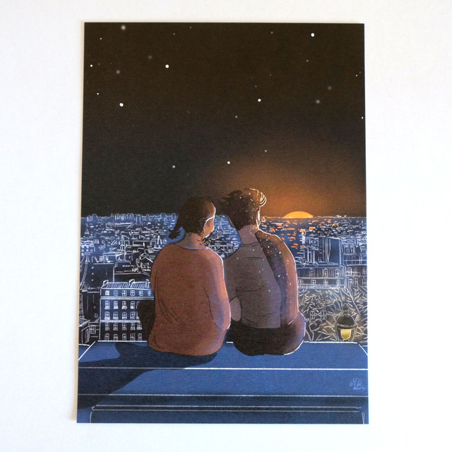 Deux adolescents regardent la ville qui s'endors par une chaude nuit d'été. Cette illustration est inspirée de la pièce théâtre "La nuit du thermomètre", de Diastème et interprété par la compagnie B612.
