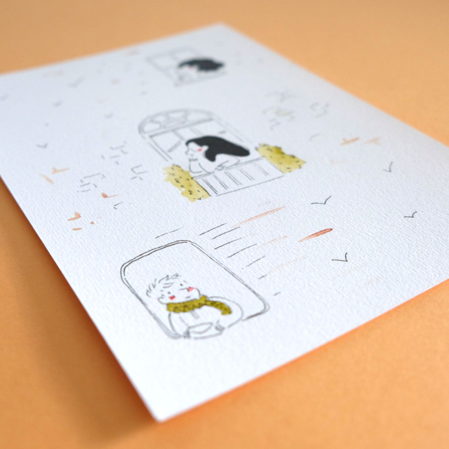 "Par la fenêtre" est une illustration originale unique au feutre et à l'aquarelle.